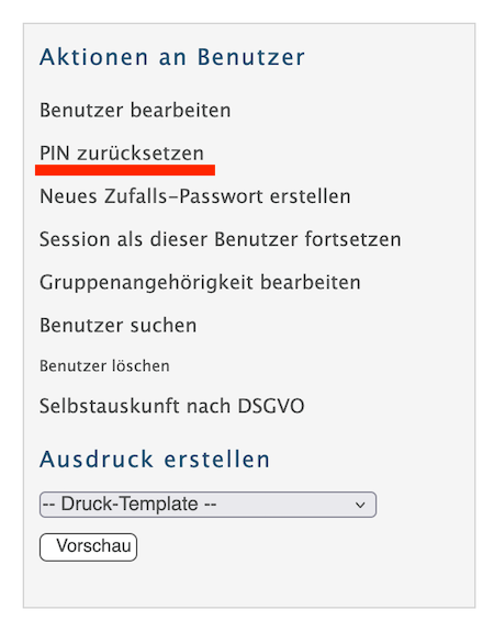 - Rechts bei "Aktionen an Benutzer" auf "PIN zurücksetzen" klicken