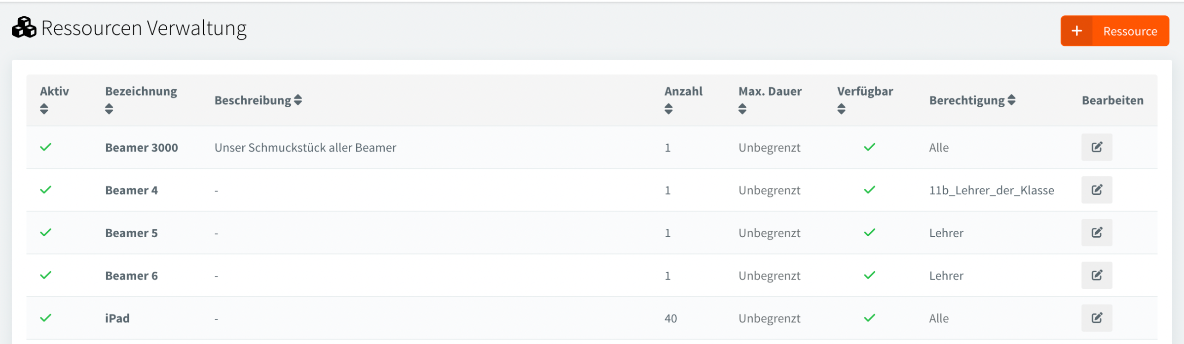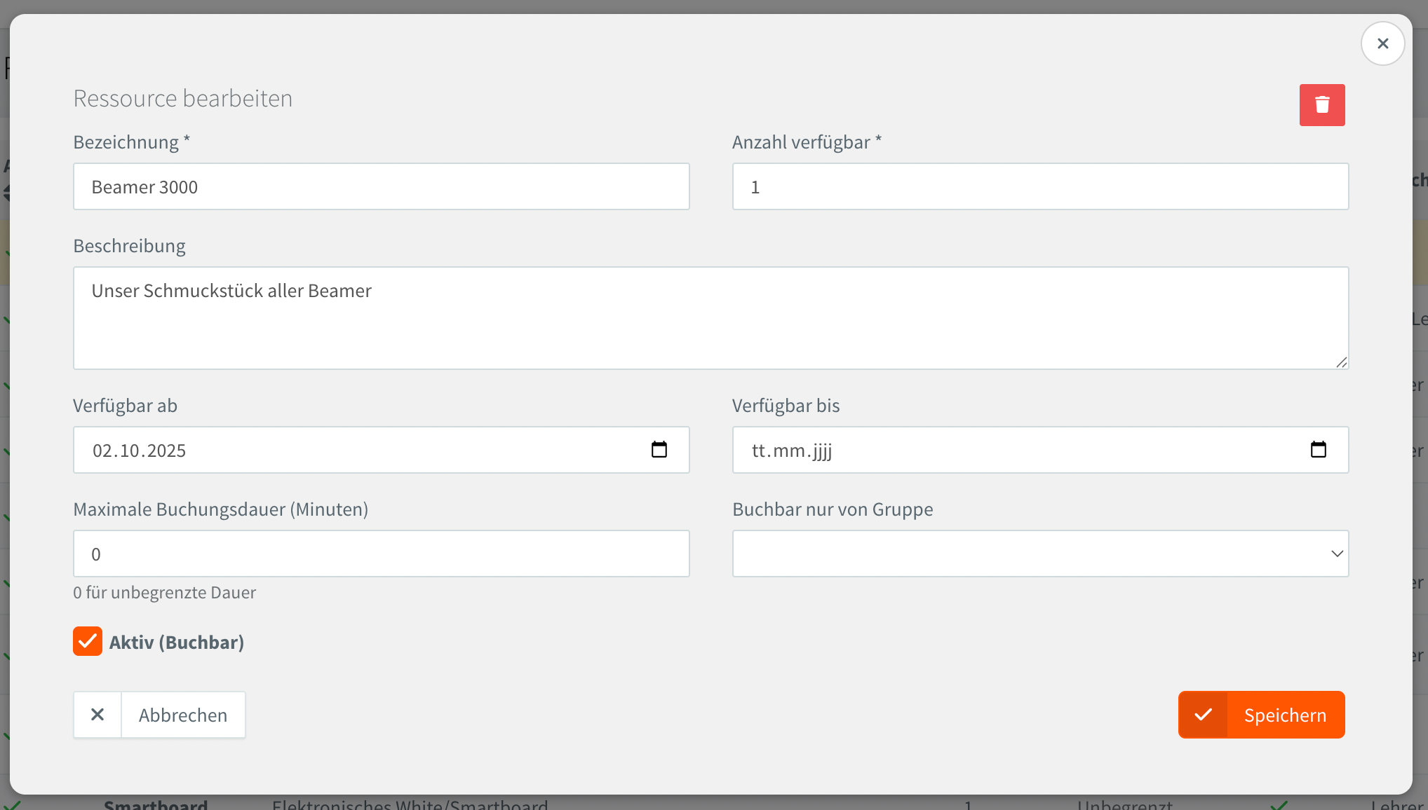 Buchbar nur von Gruppe kann auf "Alle Gruppen" eingestellt werden, dann können Lehrer, Admins und Verwaltung buchen. Die Einschränkung ist z.B. für Ressourcen die nur für die Verwaltung gedacht sind. Eltern & Schüler können Ressourcenbuchungen weder sehen noch tätigen.