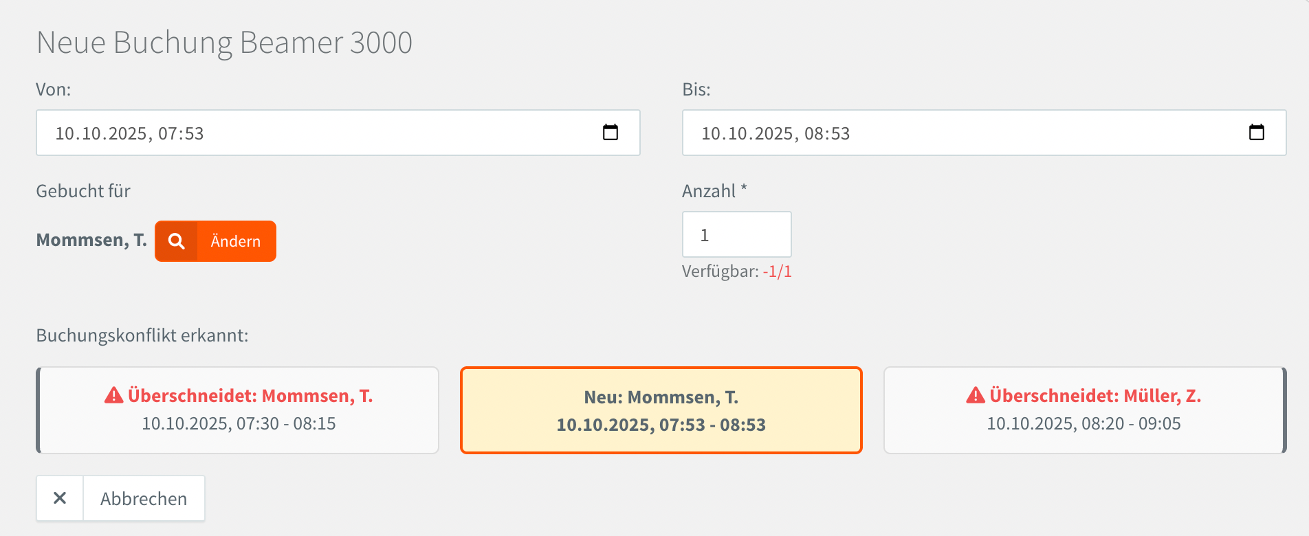 Bei einer neuen Buchung oder beim Bearbeiten einer bestehenden Buchung wird vor Überschneidungen gewarnt.