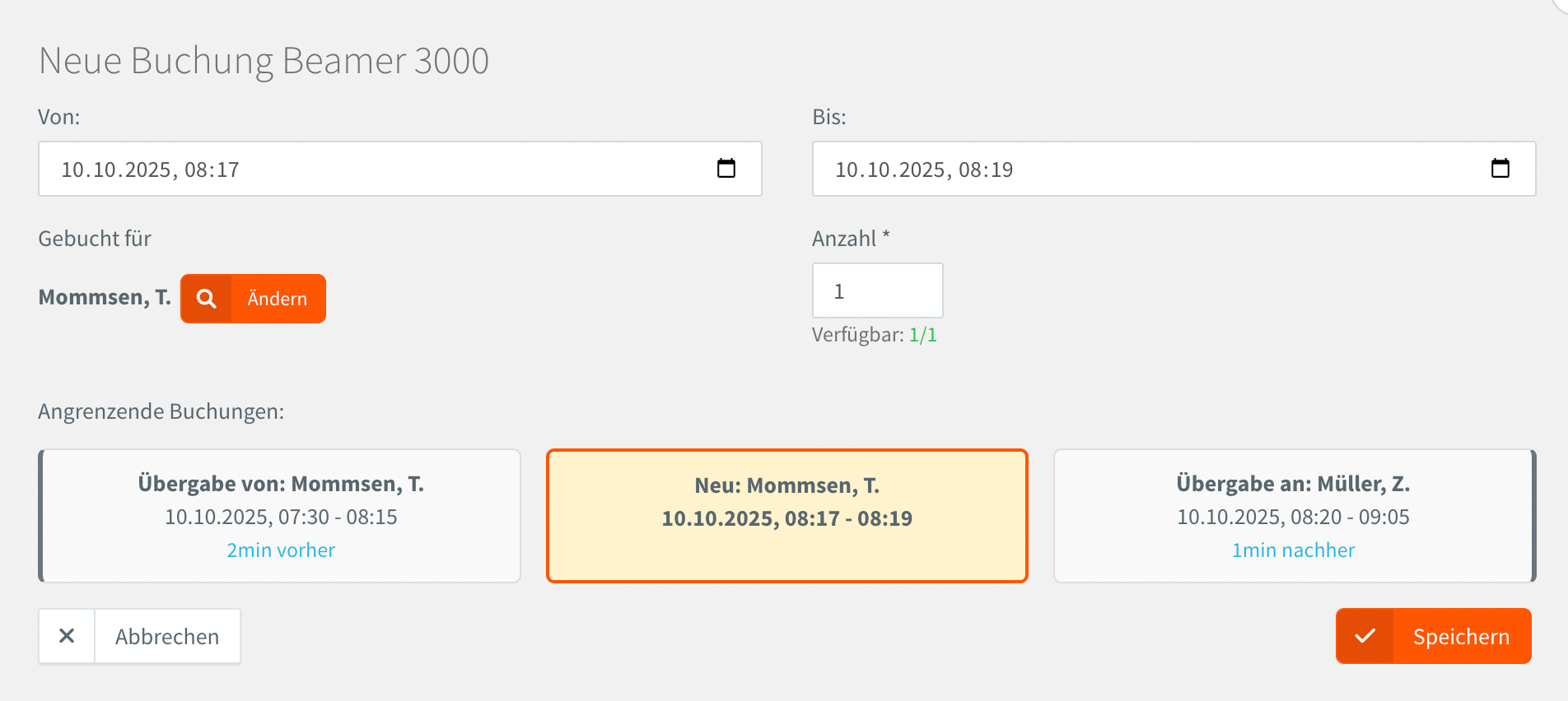 Wir empfehlen wenn es sich nur um geringe Stückzahlen handelt, diese z.B. mit einer Zahl zu beschriften und als einzelne Ressourcen zu verwalten. Beispiel: Beamer 1, Beamer 2, Beamer 3 anstelle von einer Ressource Beamer mit Anzahl 3. Bei Anzahl > 1 einer Ressource werden keine Übergabezeiten angezeigt. Die Verfügbarkeit wird natürlich trotzdem geprüft, wenn z.B. von 20 iPads ein Kollege 3 gebucht hat, ein anderer 7, dann stehen noch 10 zur Verfügung für neue Buchungen zur gleichen (oder überschneidenden) Zeit.