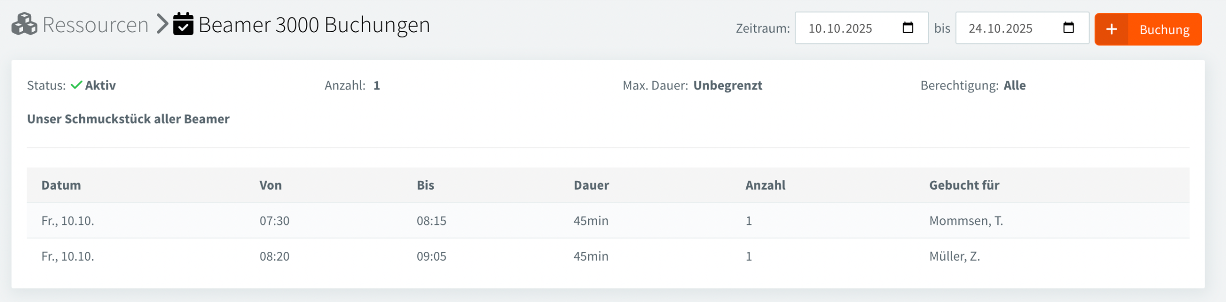 Durch Klicken auf eine Ressource in der Liste gelangt man zu allen Buchungen.