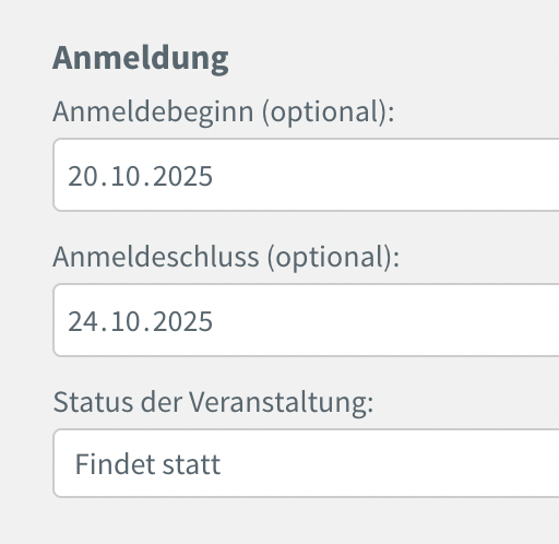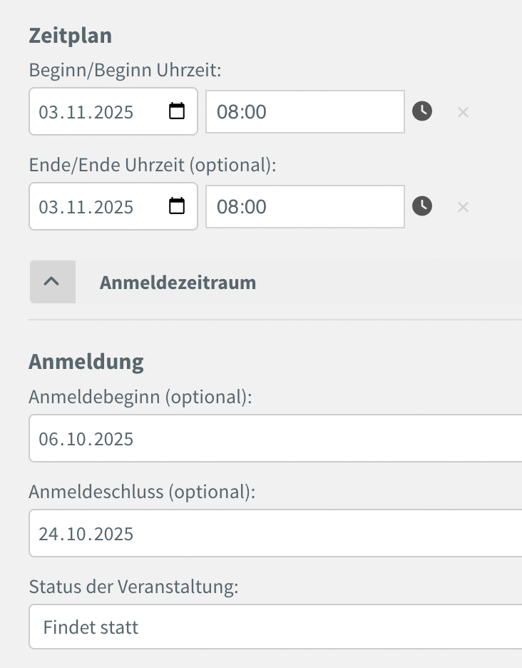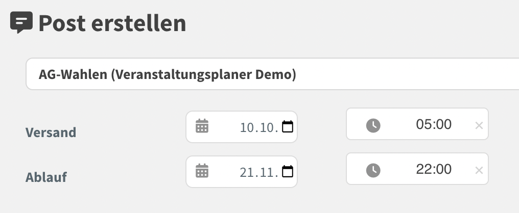 Verwenden Sie für das Post als Sichtbarkeitszeitraum den gesamten Zeitraum, inklusive der Zeit, die Lehrer haben, um eigene Veranstaltungen zu erstellen, bis zum Ende, bis wann die Betreuer Zugriff auf die Teilnehmerlisten haben sollen.