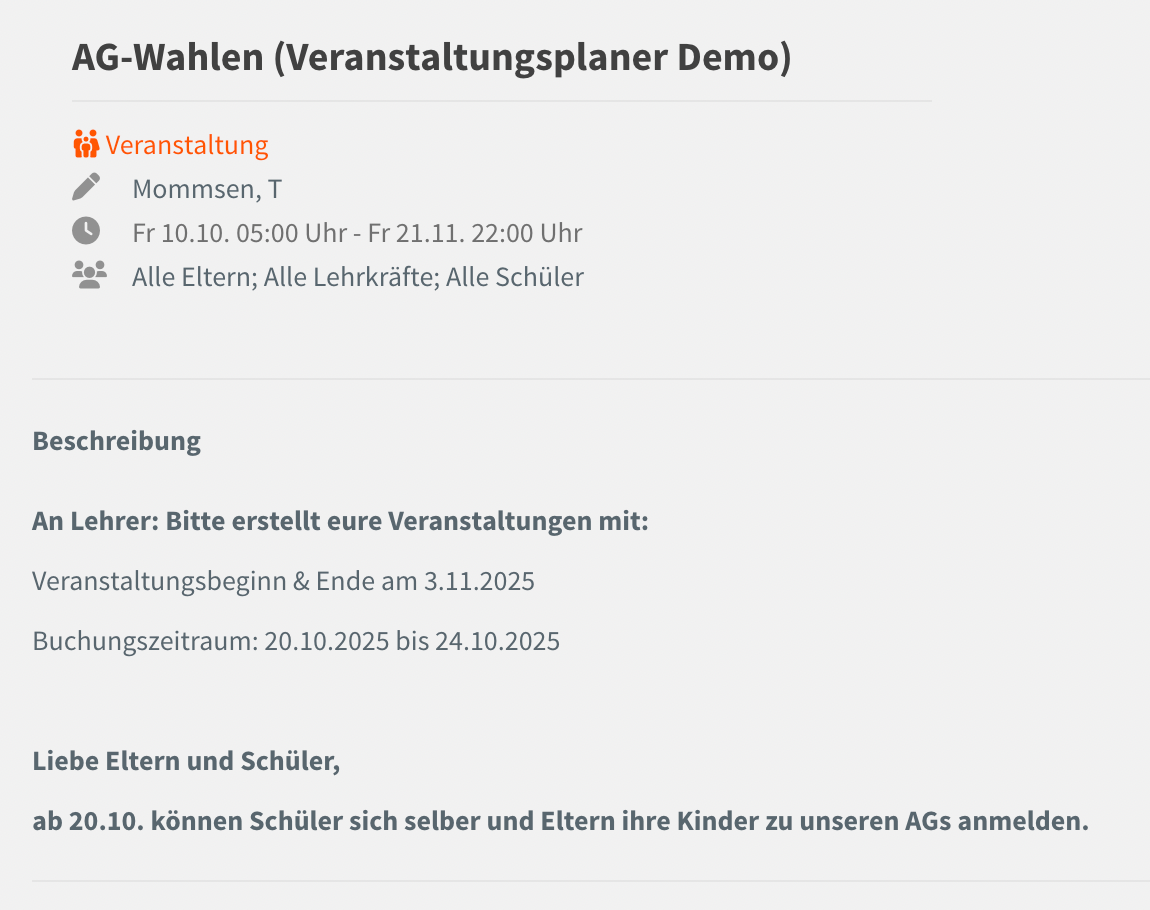 Wenn Lehrer jetzt über das + eine Veranstaltung erstellen, können diese sich nach den Hinweisen richten und die Daten entsprechend eintragen. Wenn ungewollte Fehleintragungen nicht zu verfrühten Buchungen führen dürfen, könnte das Post auch nur an Lehrer adressiert werden und erst ab Buchungsbeginn zusätzlich für Eltern und Schüler als Empfängergruppe des Posts eingetragen werden.