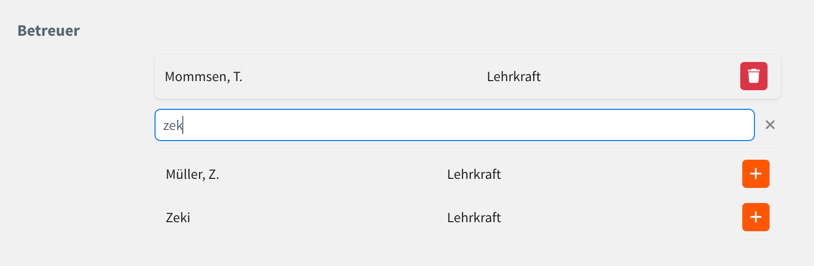 Als Betreuer wird standardmäßig der die Veranstaltung erstellende Benutzer verwendet. Es können aber auch mehrere Betreuer (oder nur andere Betreuer) eingetragen werden. Alle Betreuer haben Zugriff auf die Teilnehmerliste sowie Bearbeitungsberechtigung für diese Veranstaltung.