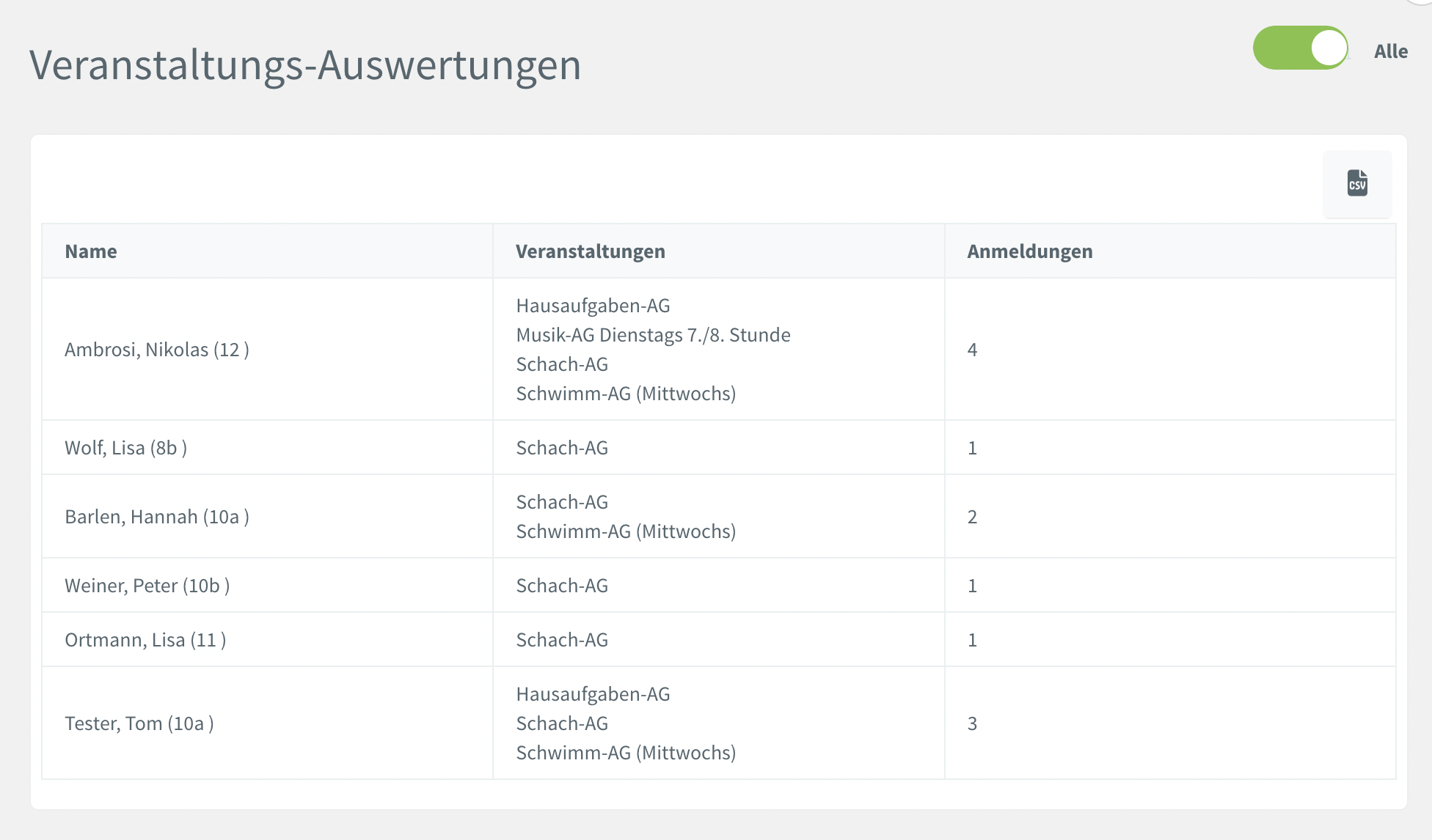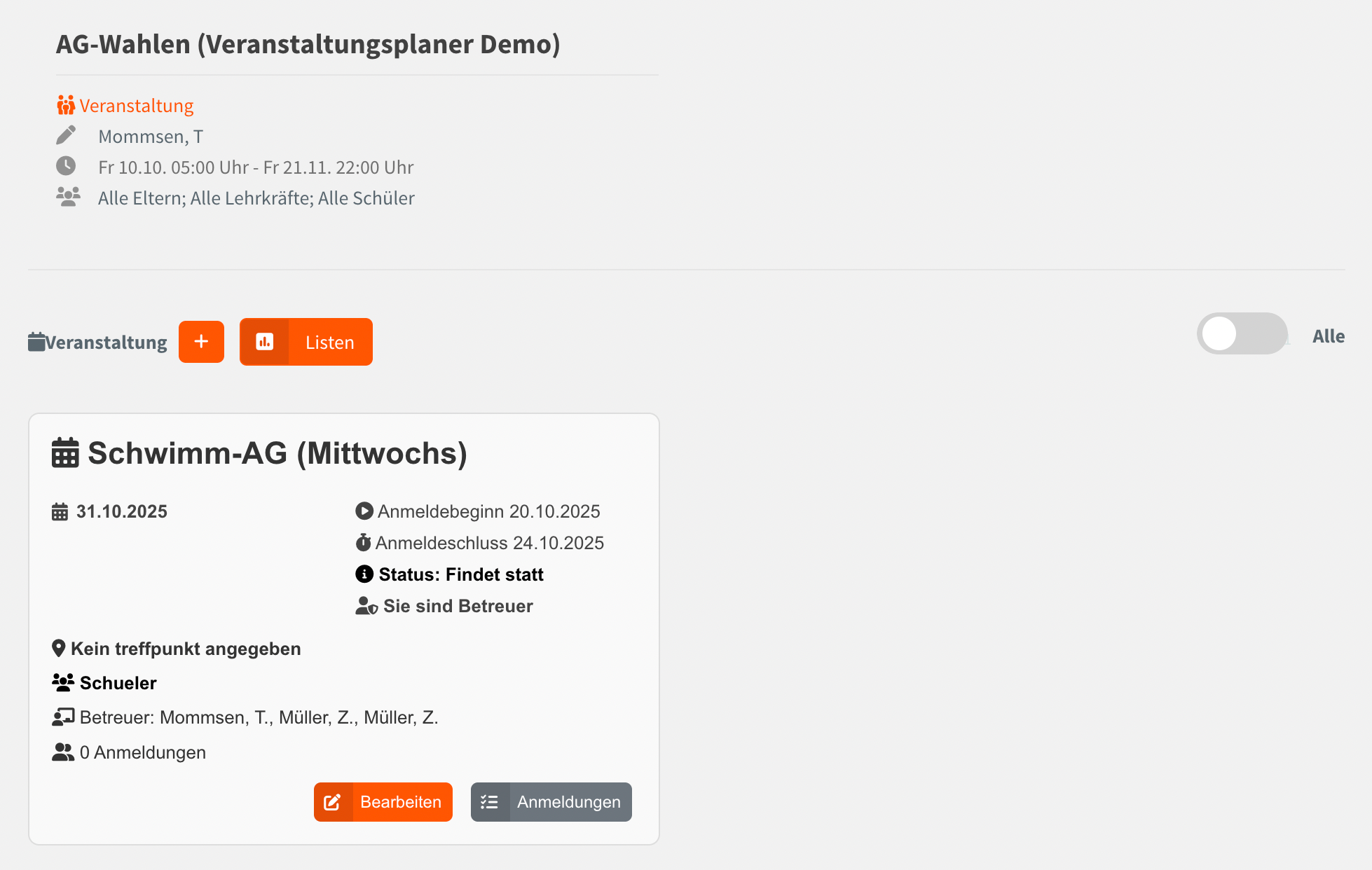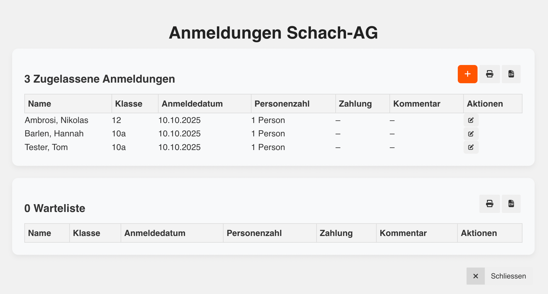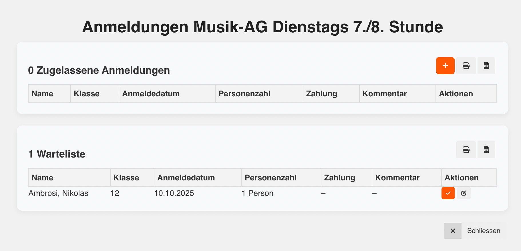 Lehrer haben über den grauen Button "Anmeldungen" Zugriff auf die Teilnehmerliste und können selbst beliebige Teilnehmer hinzufügen oder entfernen oder aus der Warteliste (wenn für die Veranstaltung aktiviert) akzeptieren.