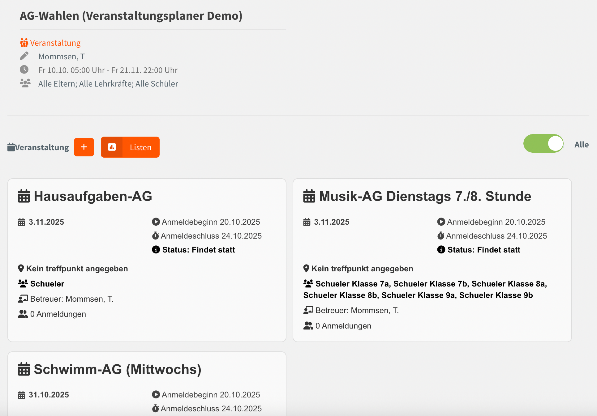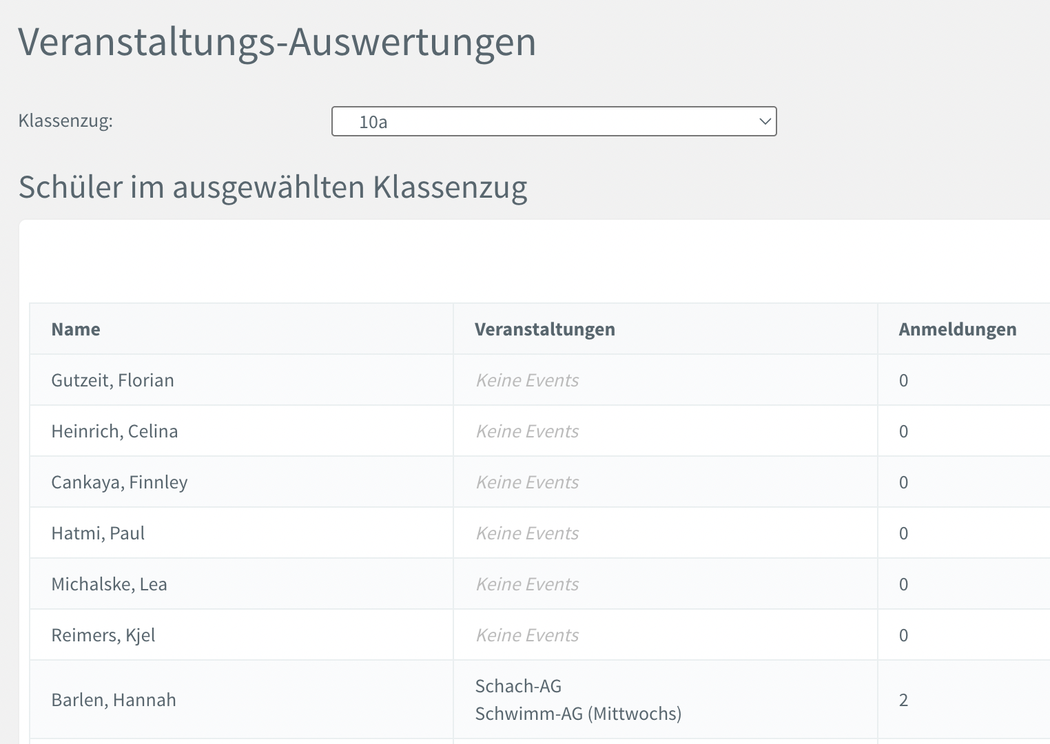 - Elternabende: Anmeldungen im Blick behalten (nicht zu verwechseln mit dem Elternsprechtags-Planer, bei dem je Lehrer ↔ Eltern Einzelgesprächszeiten vereinbart werden können)