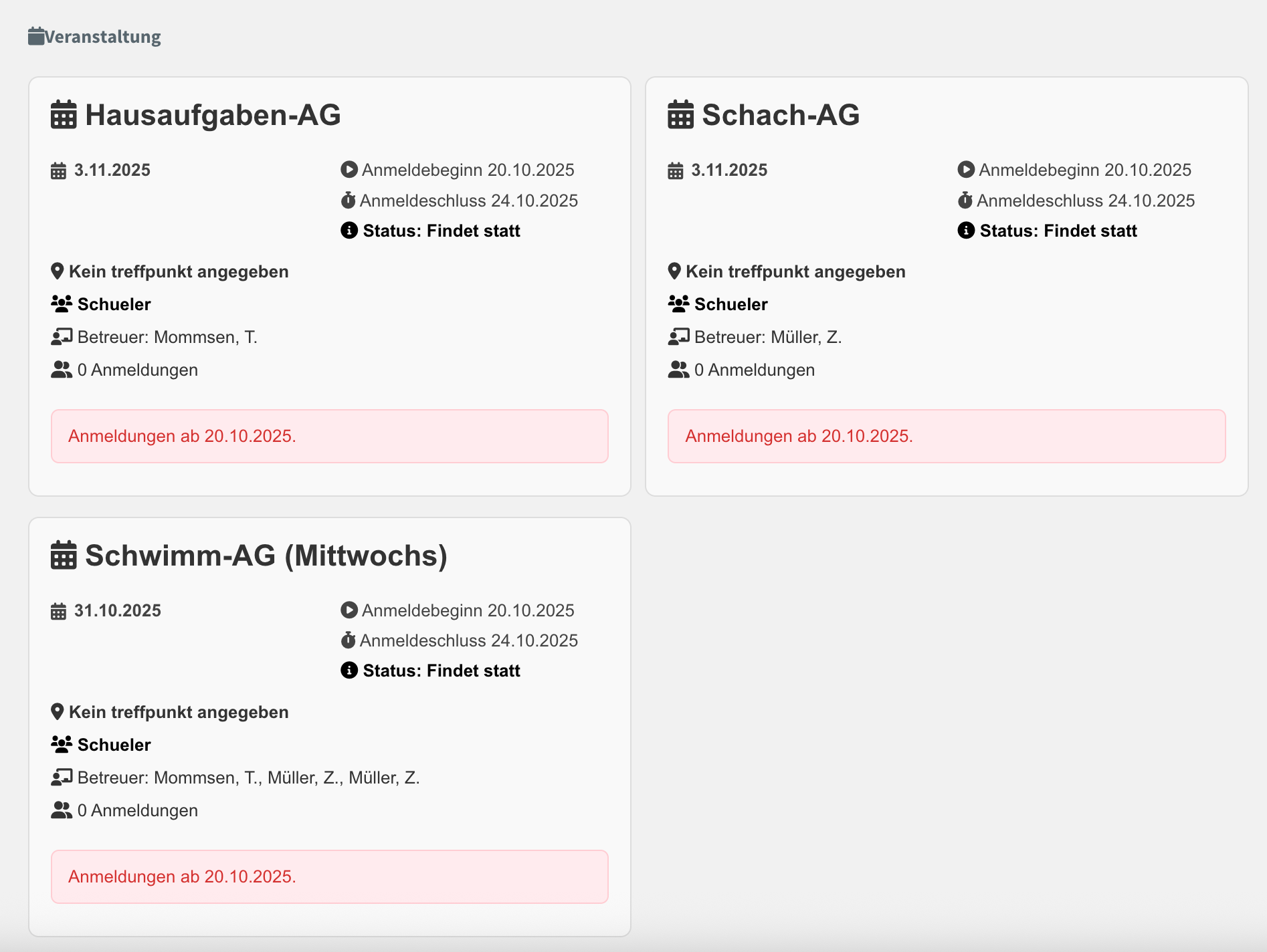 Vor Buchungsbeginn erscheinen die Veranstaltungen so für Schüler und Eltern: